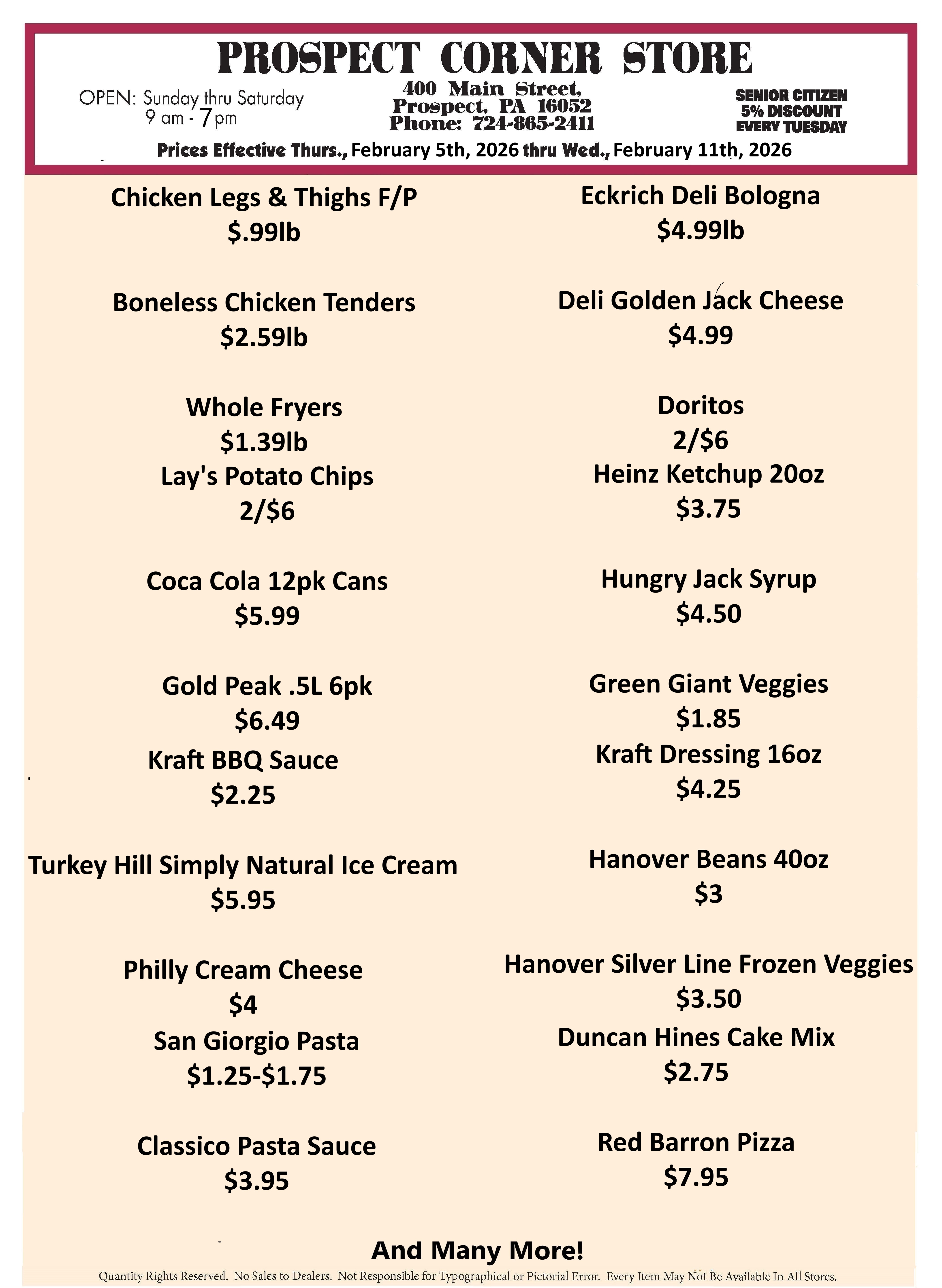 Prospect Corner Store 400 Main Street Prospect, PA 16052 |